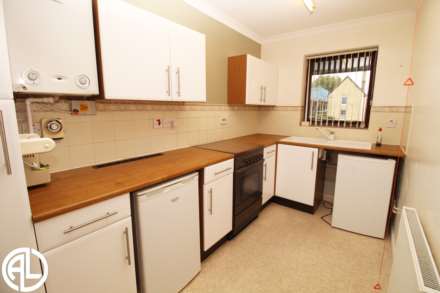 Fitted kitchen comprising of a range of wall and base units. Double glazed window. Combi boiler. Radiator.
